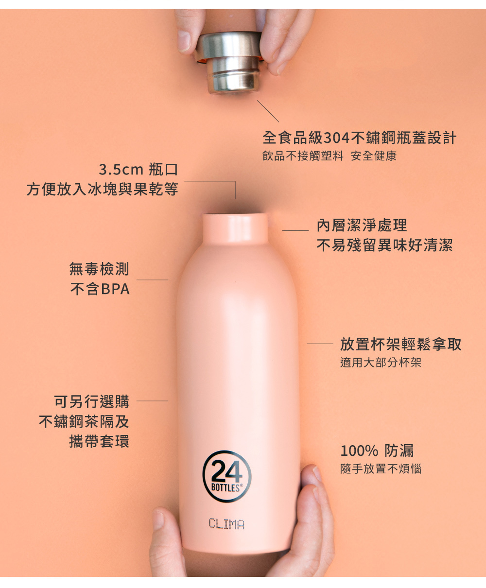 24Bottles 保溫瓶具有雙層真空斷熱層設計,有效降低熱傳導,可保溫12小時、保冷24小時。