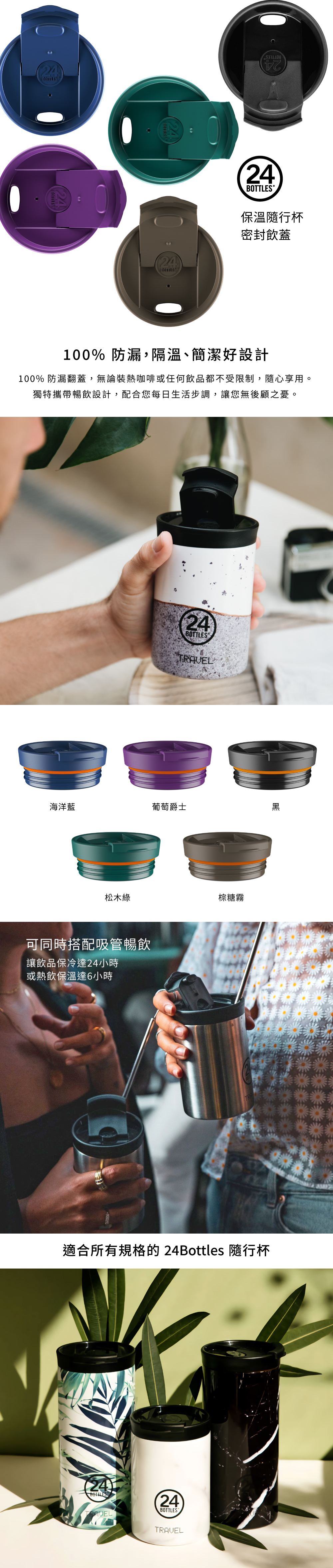 密封蓋完全防漏、安全不釋放雙酚A,適合所有規格的 24Bottles 隨行杯。