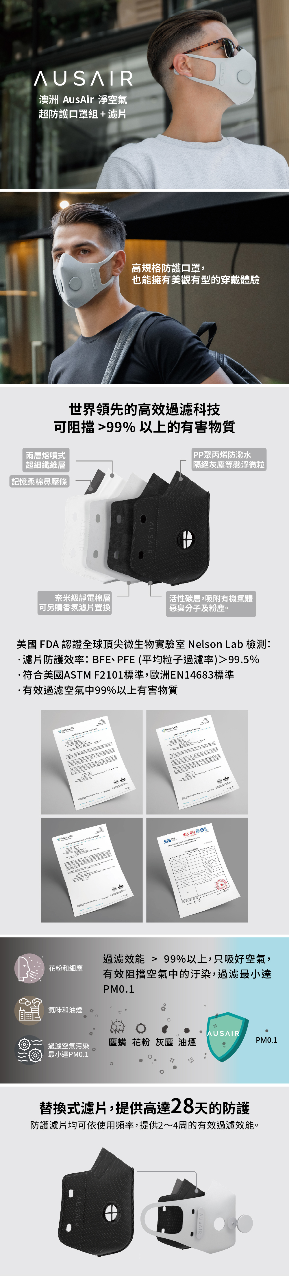 • 通過美國標準 ASTM F2101,歐洲標準EN14683檢驗