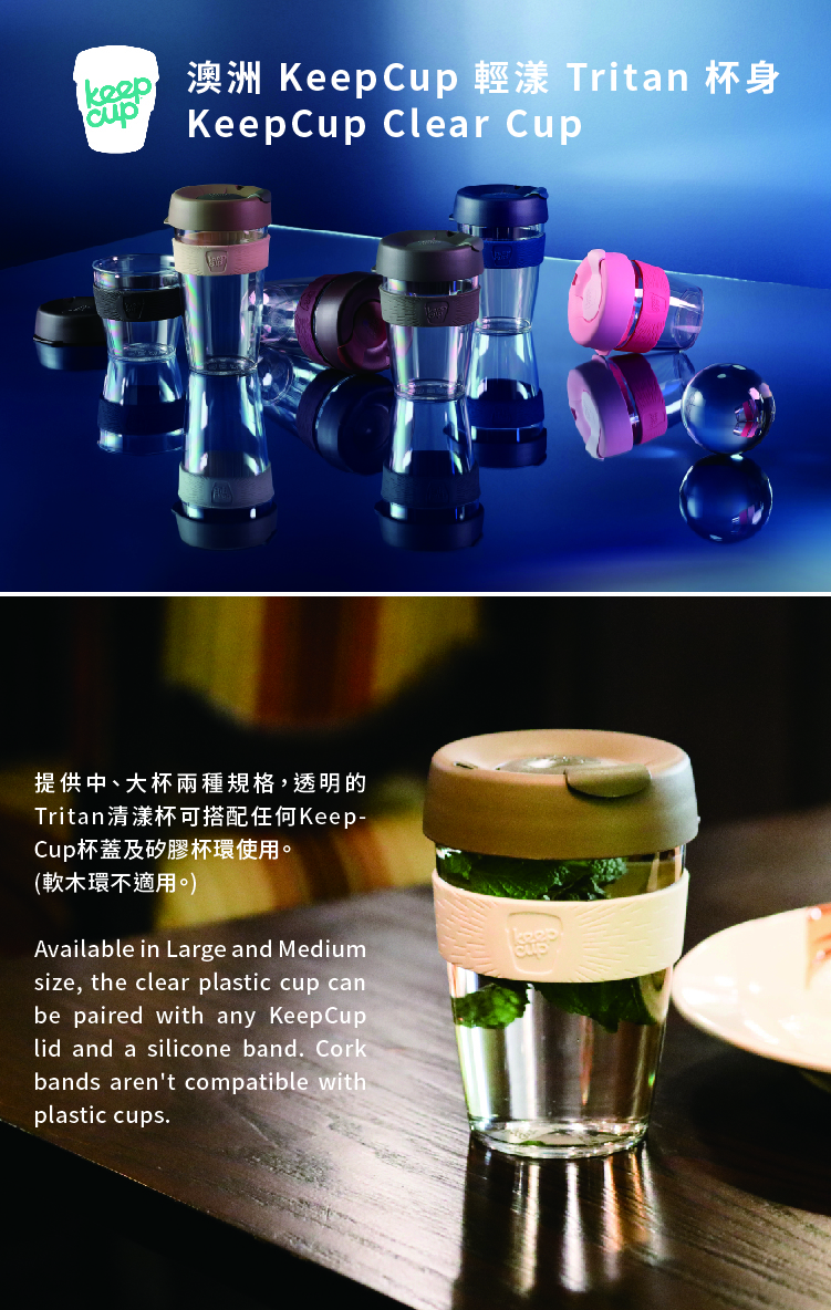 提供中、大杯兩種規格,透明的Tritan輕漾杯可搭配任何KeepCup杯蓋及矽膠杯環使用。