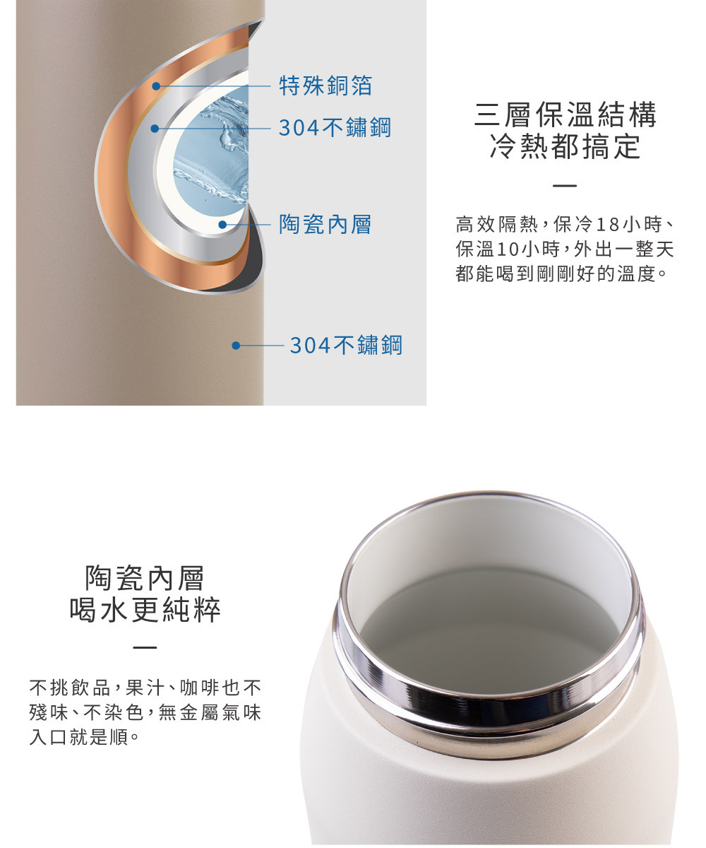 ◆ 三層保溫結構,304不鏽鋼+銅箔+陶瓷內層