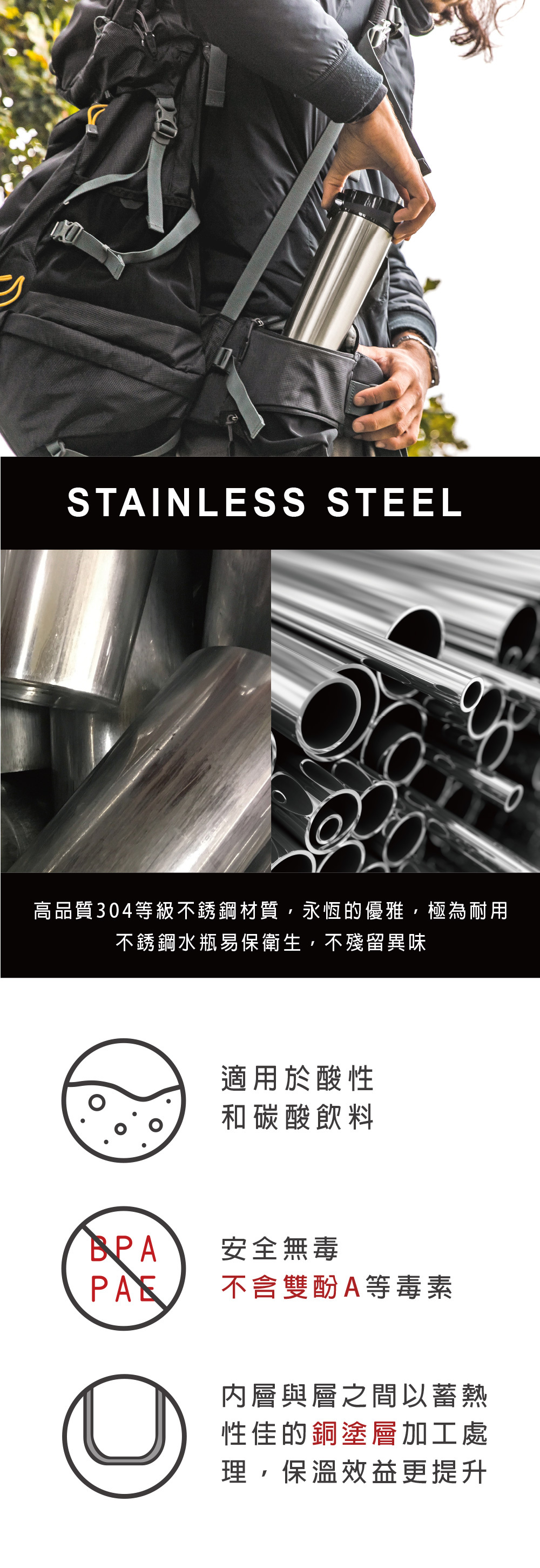 ◆ 使用雙層食品級304不繡鋼製造,無味、可回收